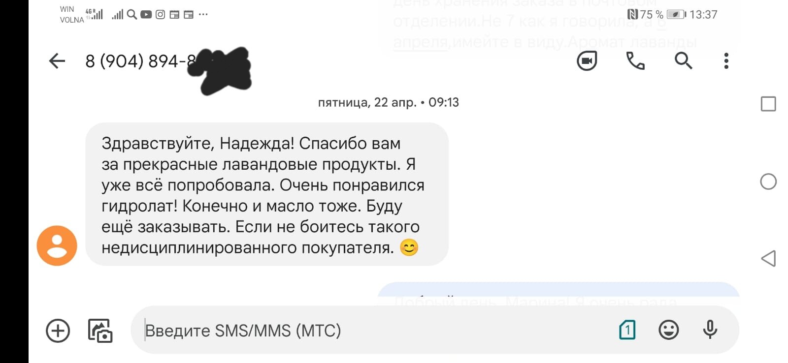 Настоящий аромат лаванды успокаивает и расслабляет. Я фанат этого сайта. Заказывала и пользоваласЬ почти всеми продуктами. Благодарна Надежде, все товары просто бомба!